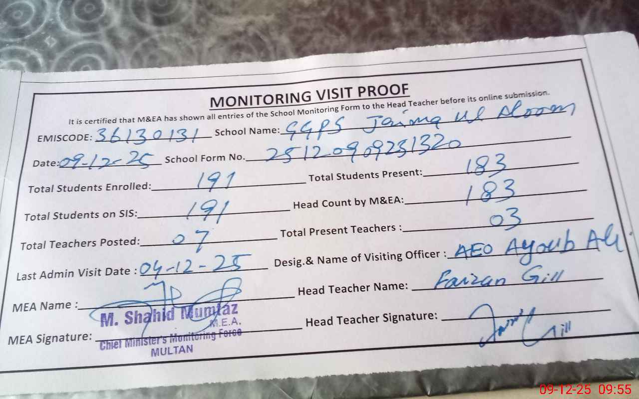 | EMIS Code: 36130131 | Name of School: GPS JAMI UL ALOOM DOULAT GATE MULTAN | |||