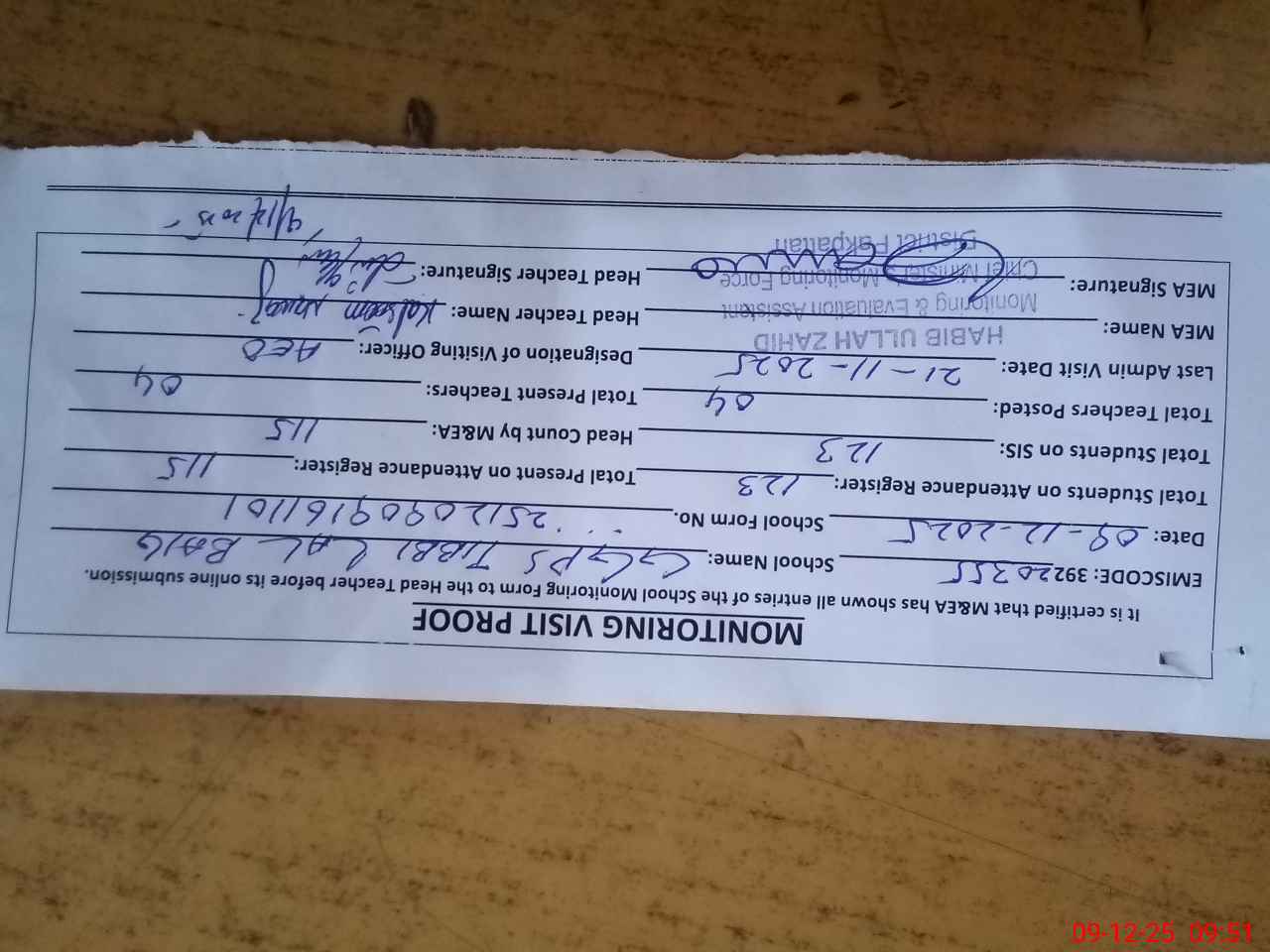 | EMIS Code: 39220355 | Name of School: GGPS TIBBI LAL BAIG | |||