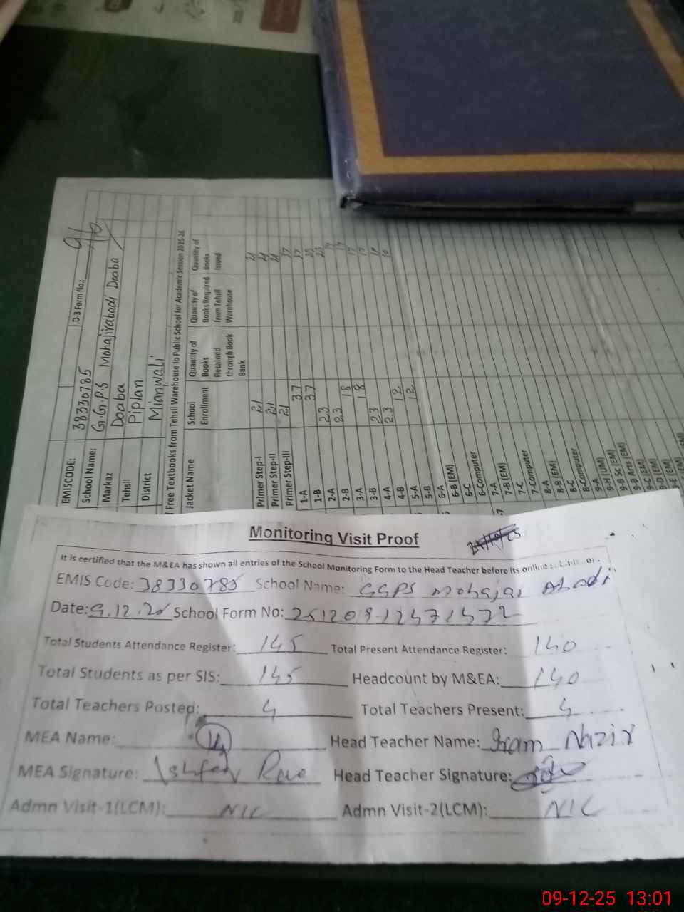 | Attendance Register | Head Teacher | MEA with School | Visit Proof |