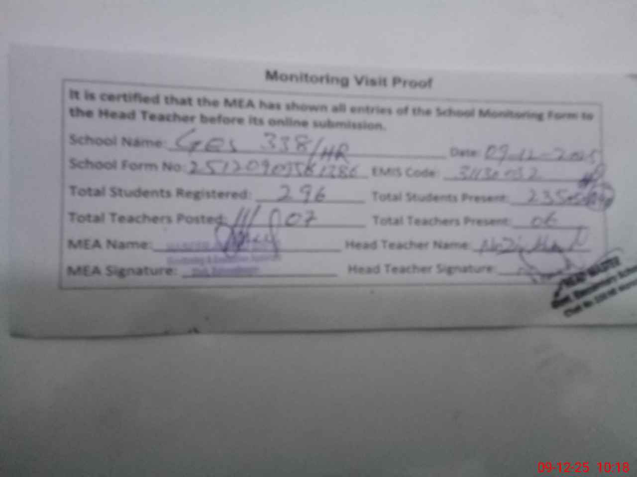 | Attendance Register | Head Teacher | MEA with School | Visit Proof |