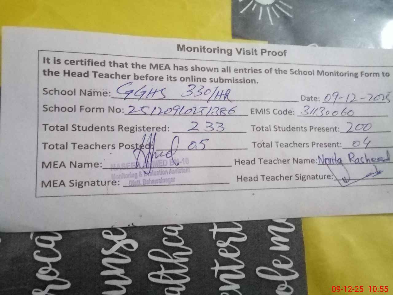 | Attendance Register | Head Teacher | MEA with School | Visit Proof |