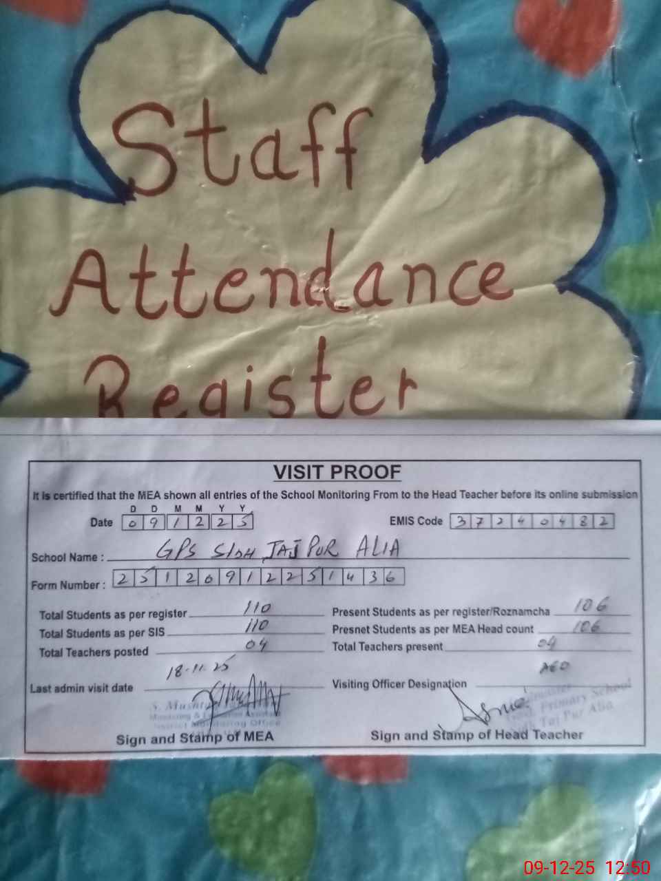 | Attendance Register | Head Teacher | MEA with School | Visit Proof |