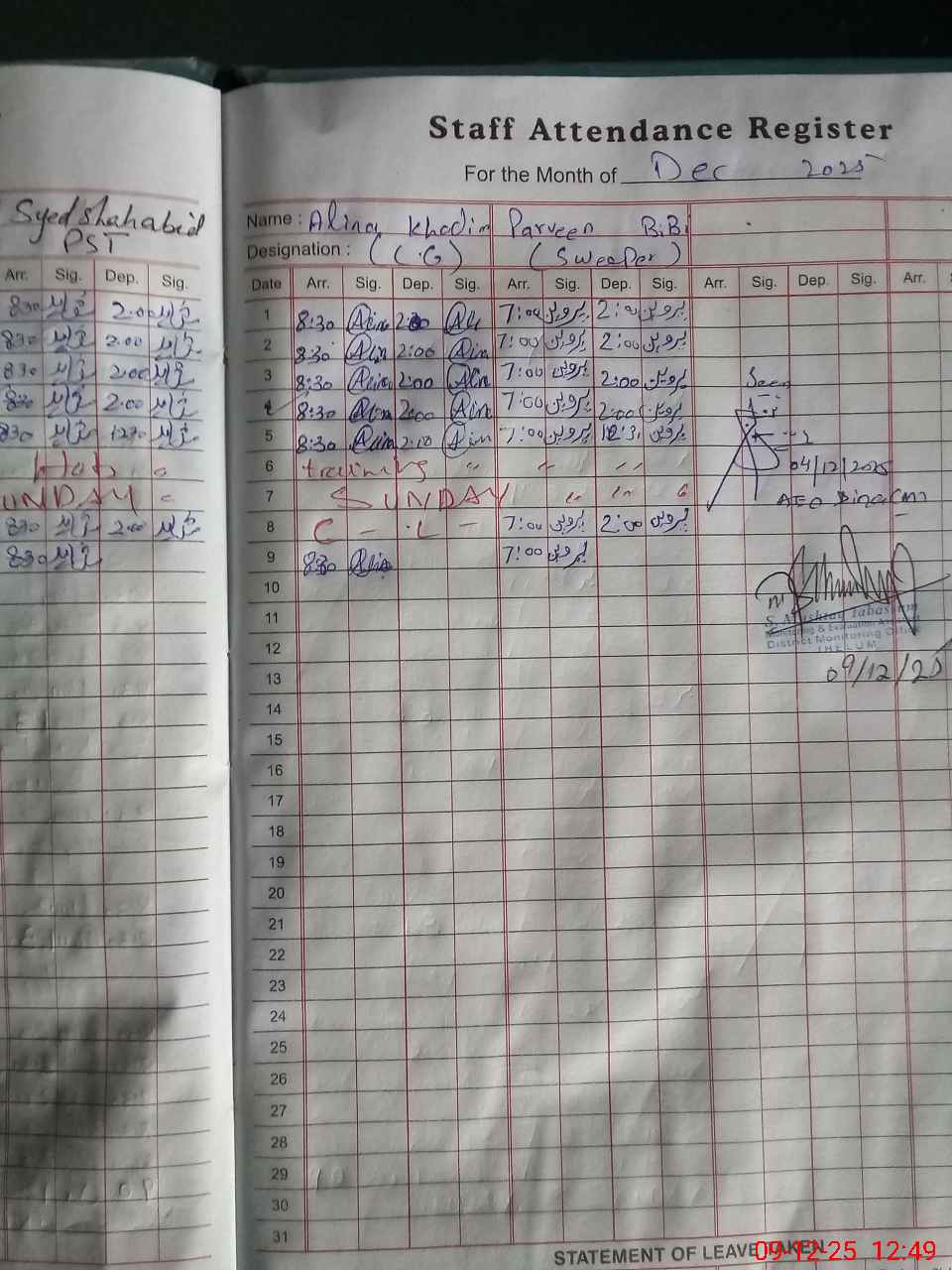 | CNIC | Full Name | Designation | R/C | Absence During Last Calender Month |