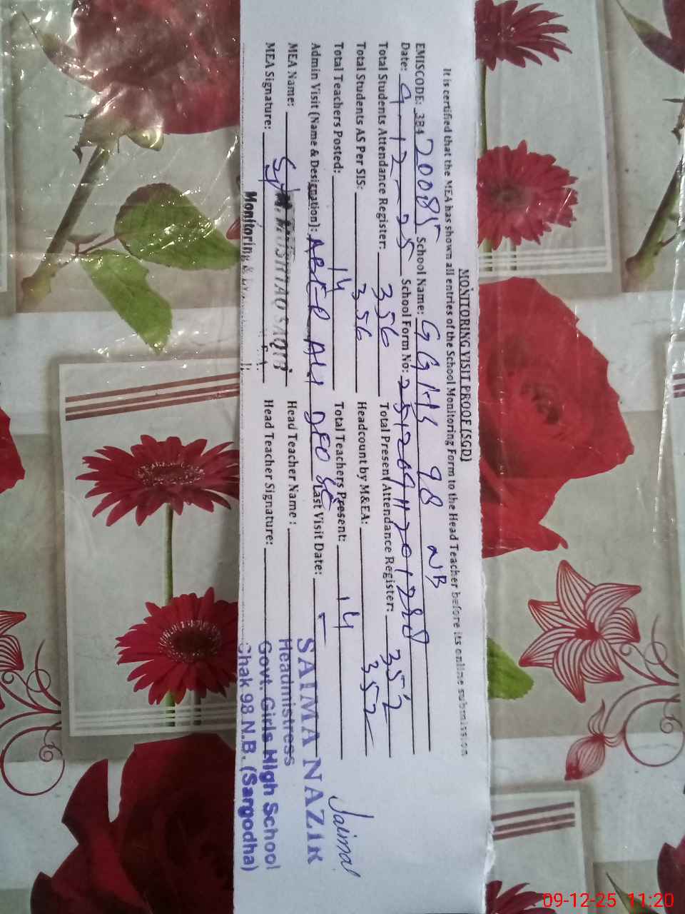 | EMIS Code: 38420085 | Name of School: GGHS CHAK NO.98 NB | |||