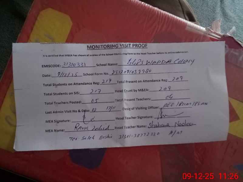 | EMIS Code: 31310331 | Name of School: GGPS WAPDA COLONY (After Noon) | |||