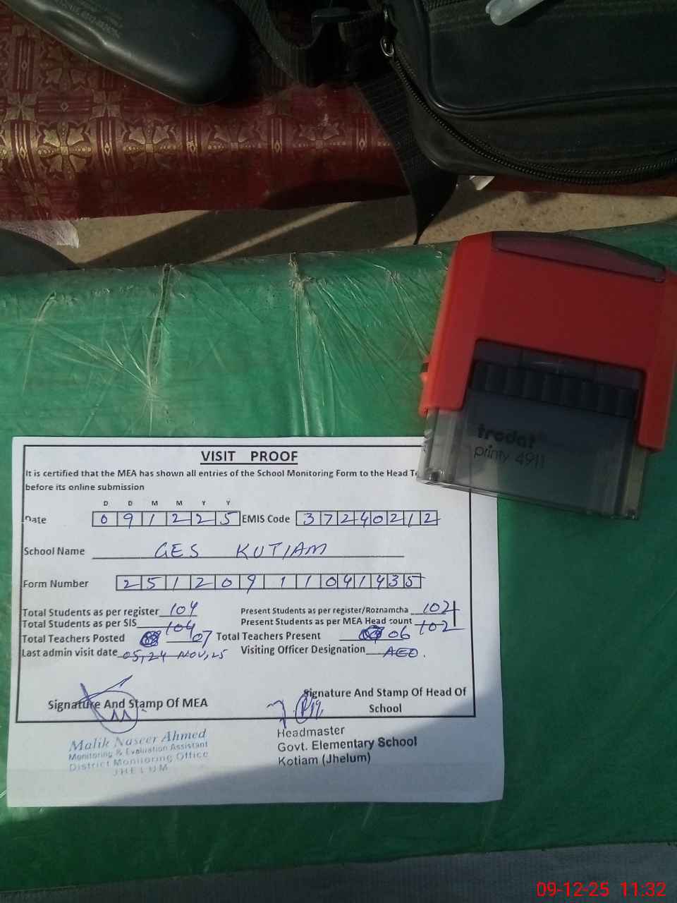 | Attendance Register | Head Teacher | MEA with School | Visit Proof |