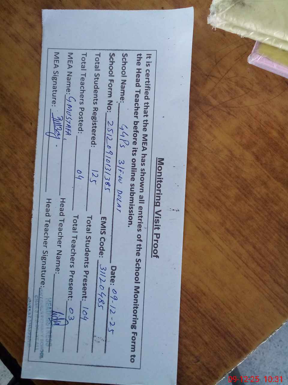 | Attendance Register | Head Teacher | MEA with School | Visit Proof |