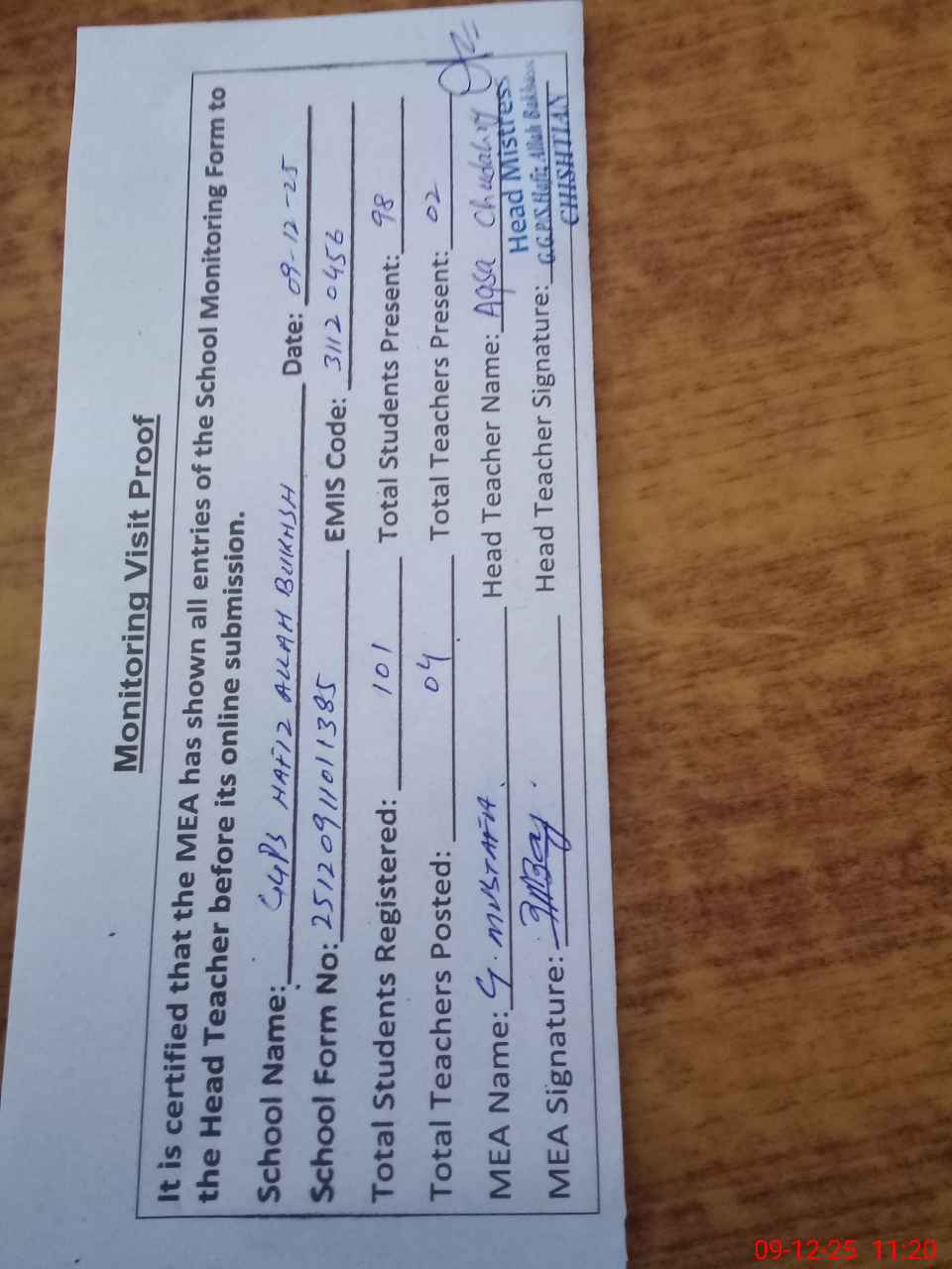 | Attendance Register | Head Teacher | MEA with School | Visit Proof |