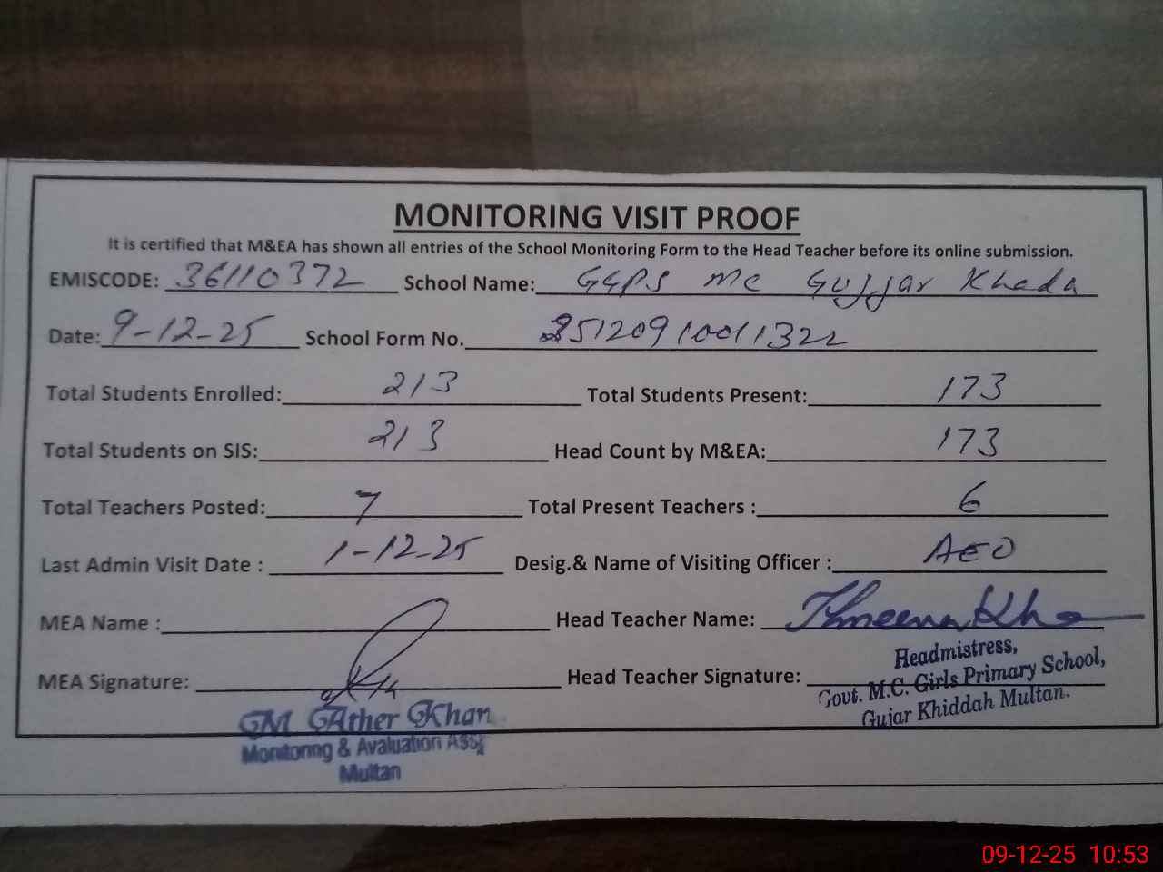 | Attendance Register | Head Teacher | MEA with School | Visit Proof |
