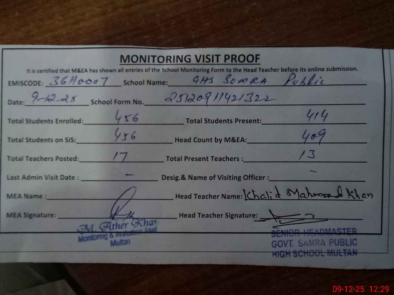 | EMIS Code: 36110007 | Name of School: GHS SUMRA PUBLIC HASSAN PARWANA ROAD MULTAN | |||
