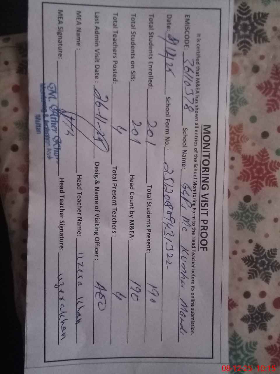 | EMIS Code: 36110378 | Name of School: GGPS MC KUMHAR MANDI WALAYAT ABAD NO.1 MULTAN | |||