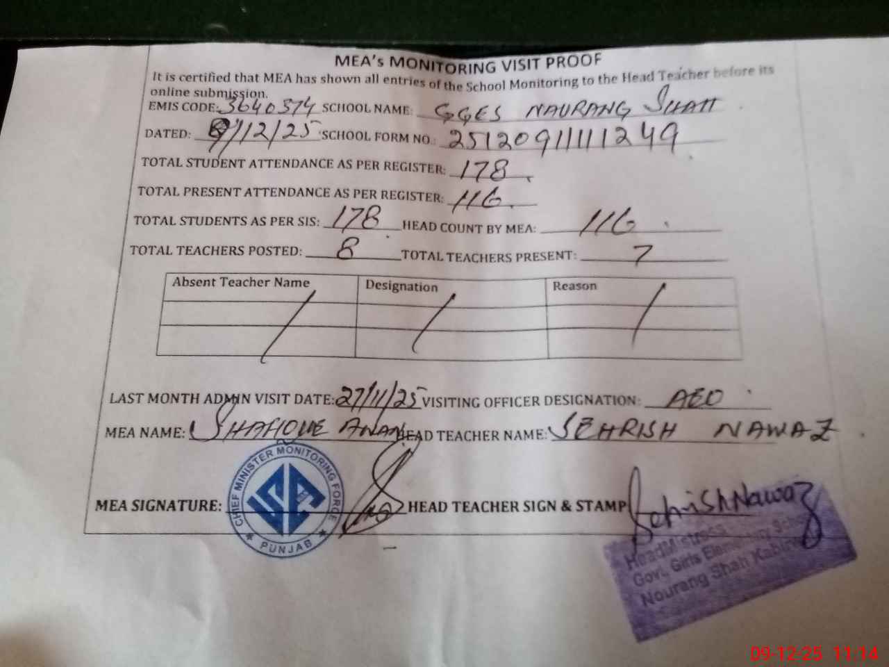 | Attendance Register | Head Teacher | MEA with School | Visit Proof |