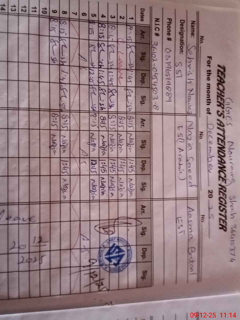 | Name: Se**** Ne**** Designation: (School Headmaster's/Headmistress's) SST Phone/Cell Number: 03**** |