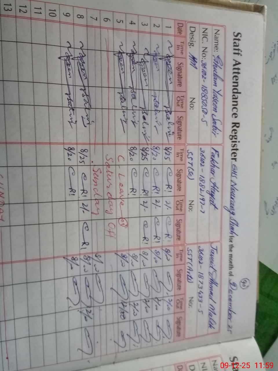 | CNIC | Full Name | Designation | R/C | Absence during last cal. month |