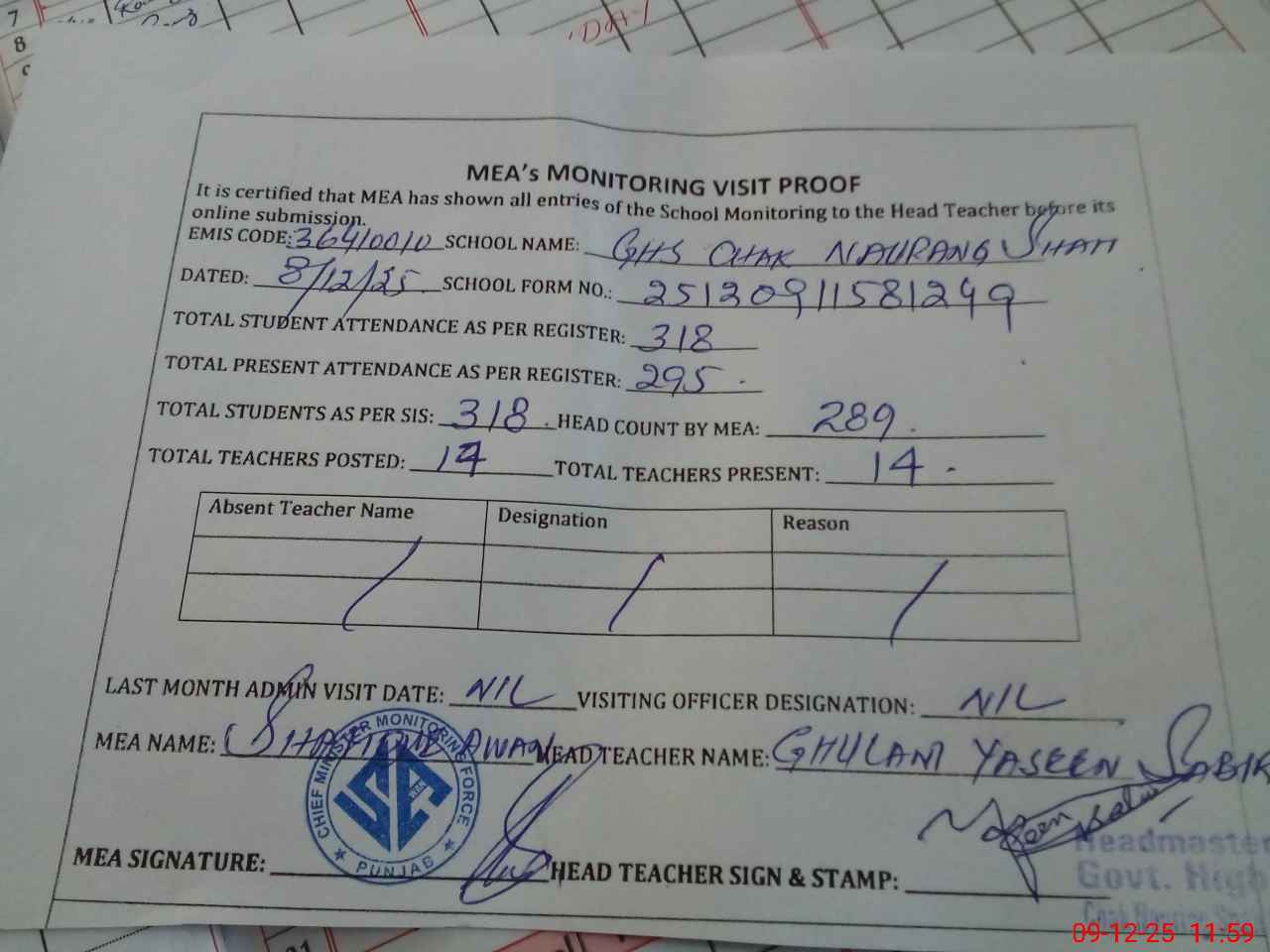 | Attendance Register | Head Teacher | MEA with School | Visit Proof |