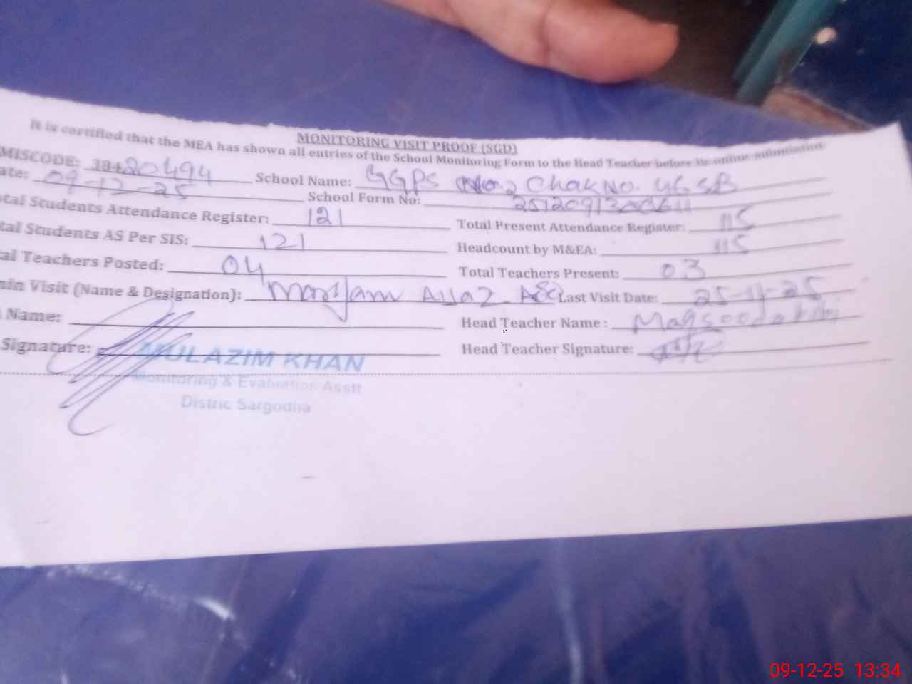 | Attendance Register | Head Teacher | MEA with School | Visit Proof |