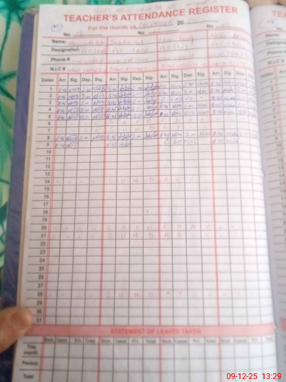 | CNIC | Full Name | Designation | R/C | Absence During Last Calender Month |