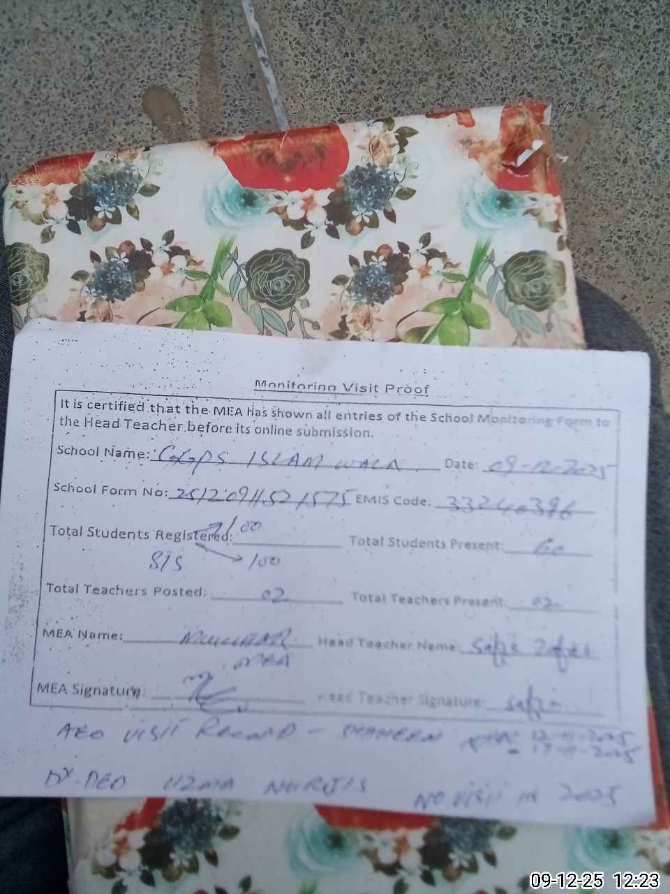 | Attendance Register | Head Teacher | MEA with School | Visit Proof |