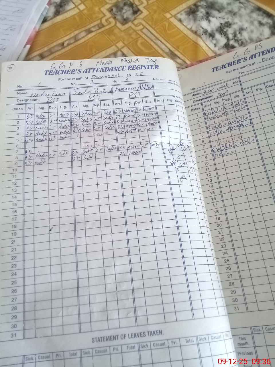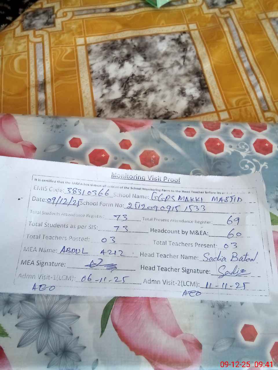 | Attendance Register | Head Teacher | MEA with School | Visit Proof |