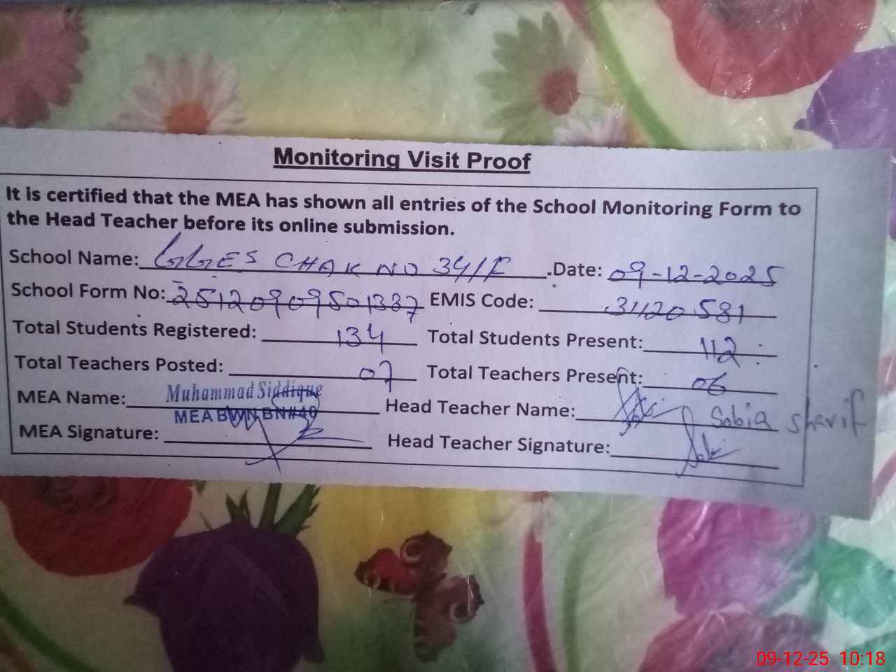 | EMIS Code: 31120581 | Name of School: GGES CHAK NO. 34/F | |||