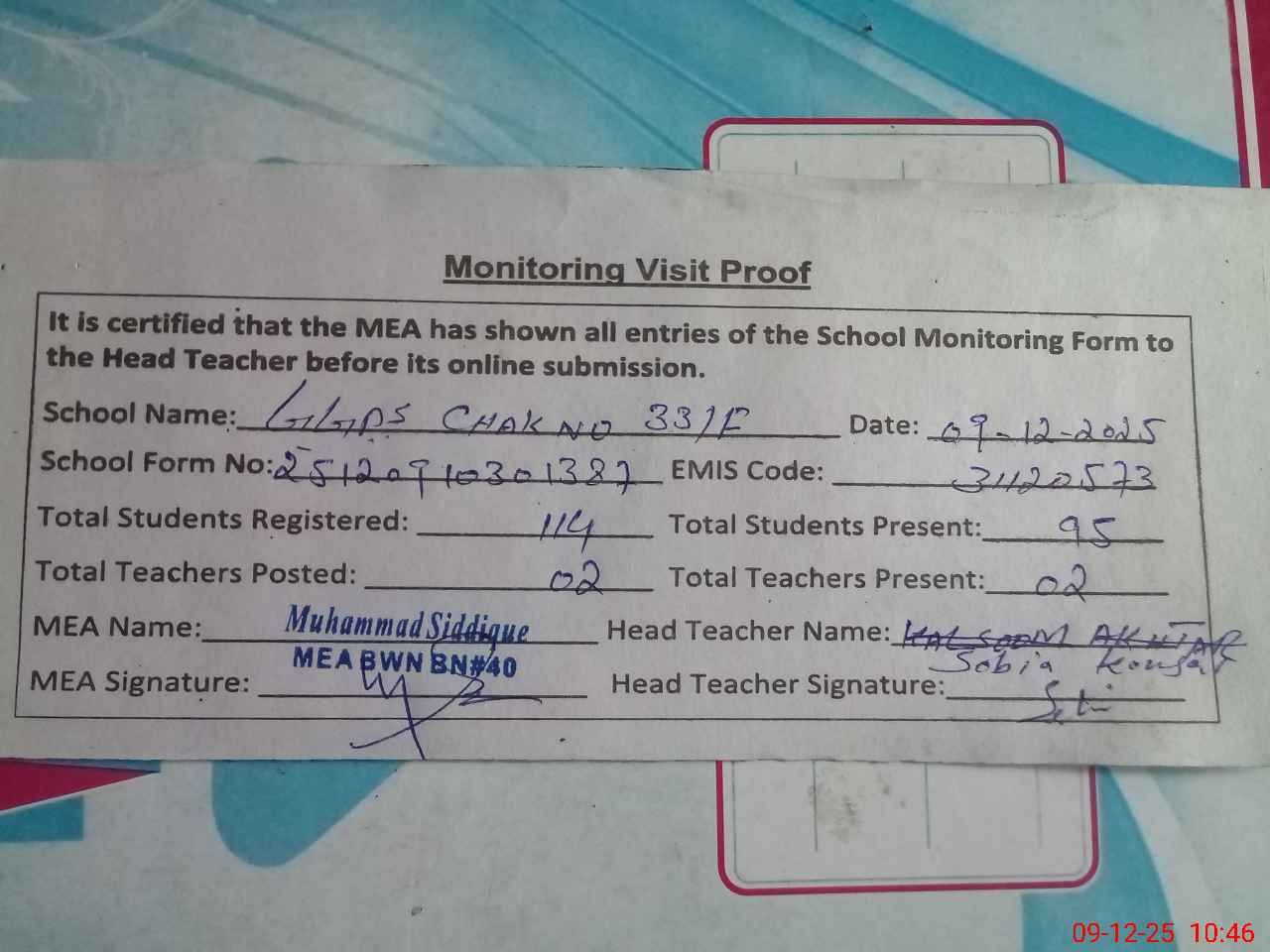 | Attendance Register | Head Teacher | MEA with School | Visit Proof |