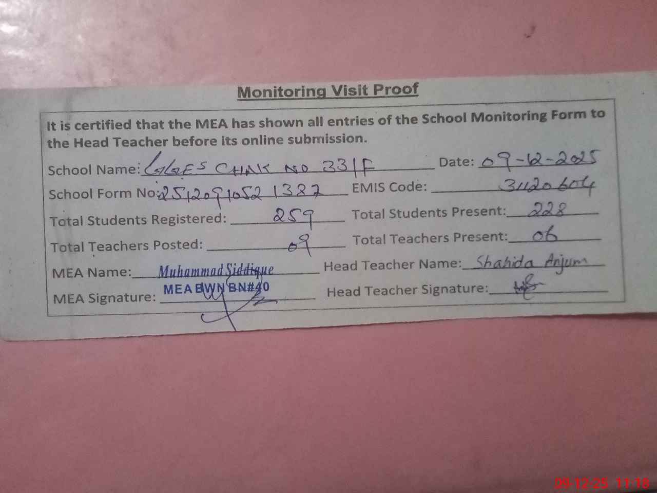 | EMIS Code: 31120604 | Name of School: GGES CHAK NO. 33/F | |||