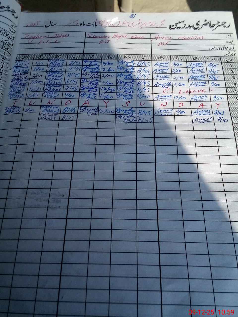 | CNIC | Full Name | Designation | R/C | Absence During Last Calender Month |
