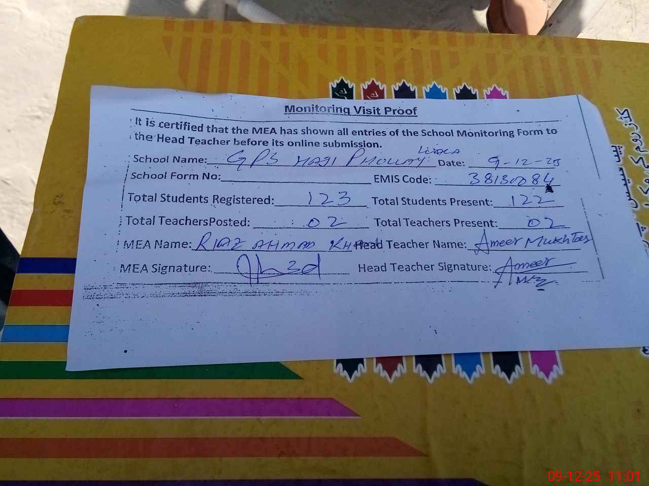 | Attendance Register | Head Teacher | MEA with School | Visit Proof |