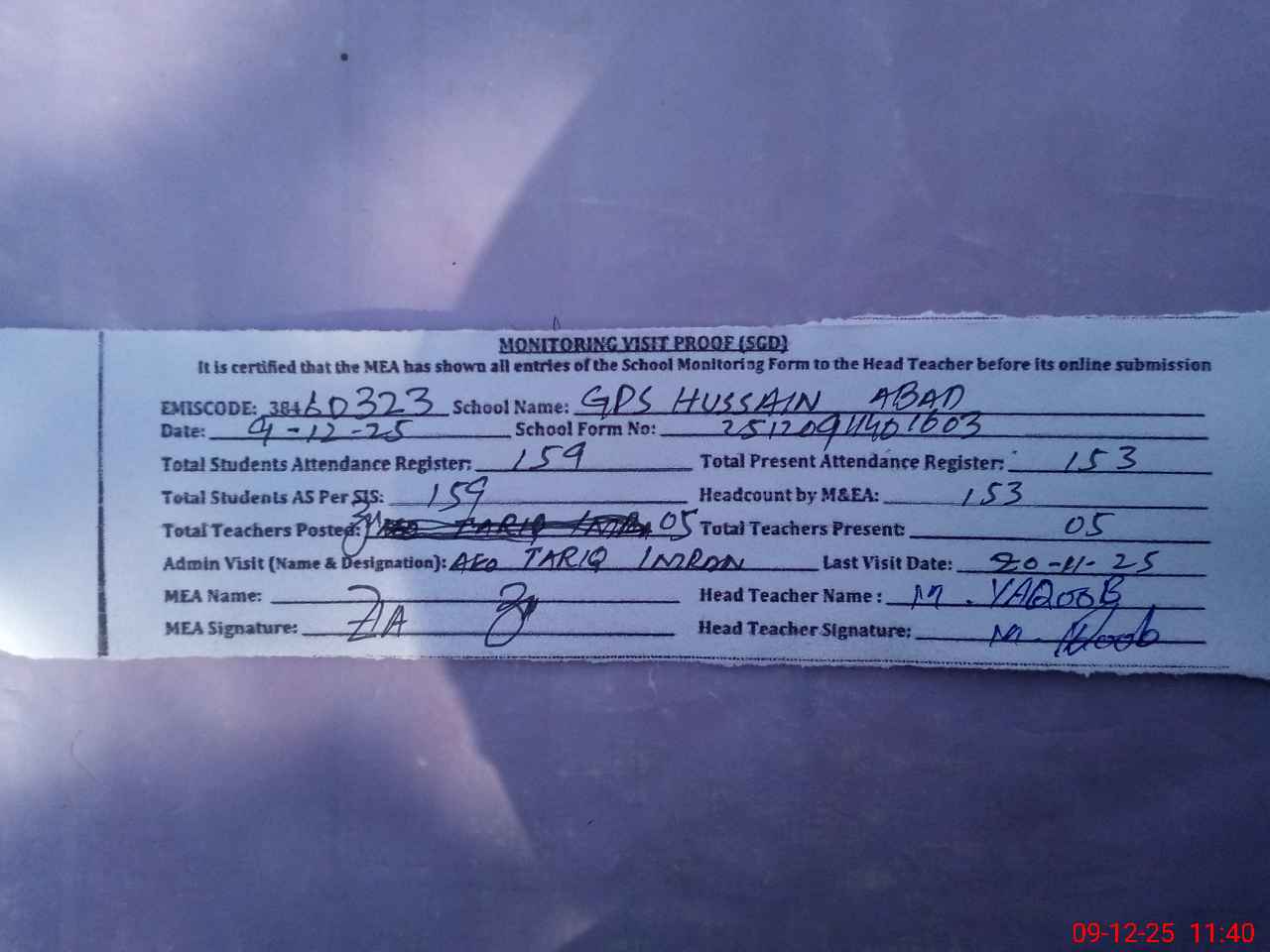 | Attendance Register | Head Teacher | MEA with School | Visit Proof |