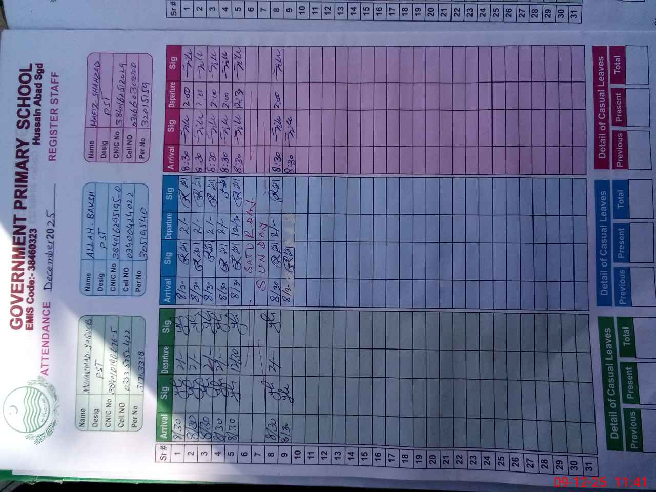 | CNIC | Full Name | Designation | R/C | Absence during last cal. month |