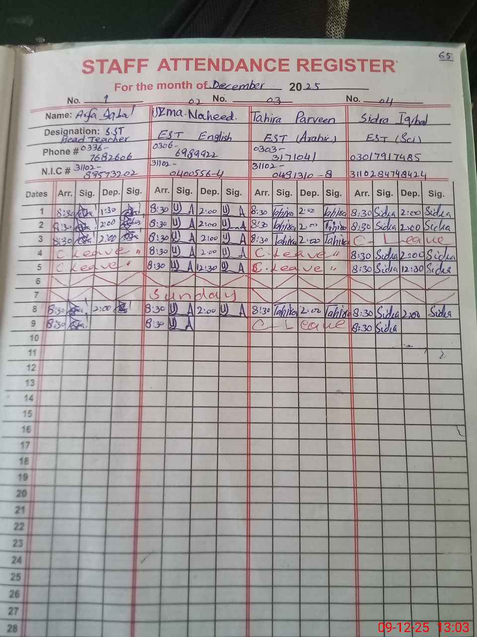 | CNIC | Full Name | Designation | R/C | Absence during last cal. month |