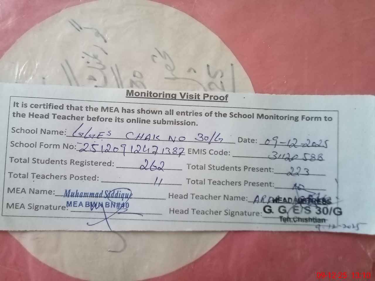| Attendance Register | Head Teacher | MEA with School | Visit Proof |
