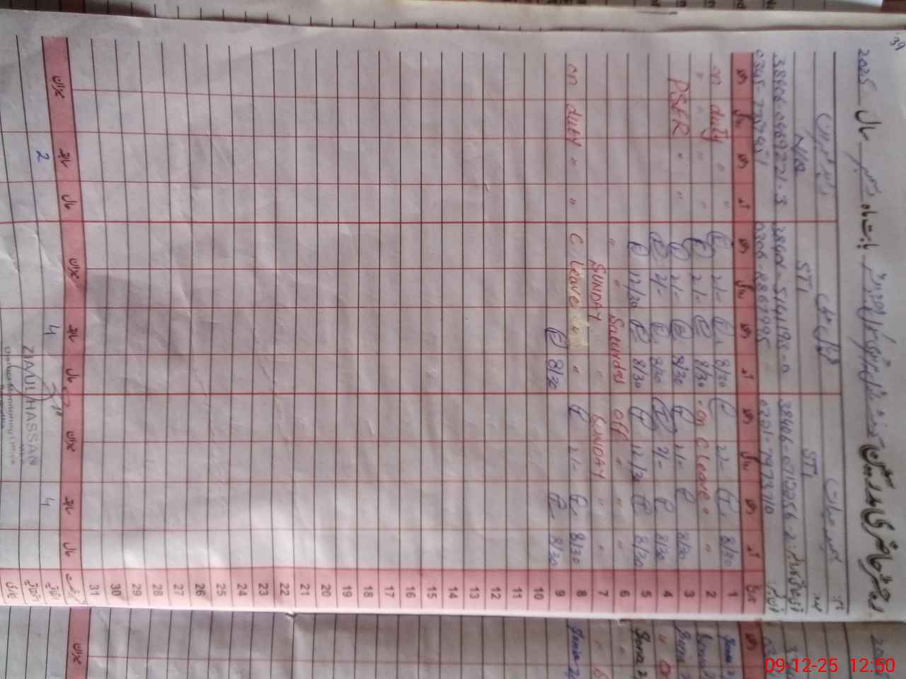 | CNIC | Full Name | Designation | R/C | Absence During Last Calender Month |