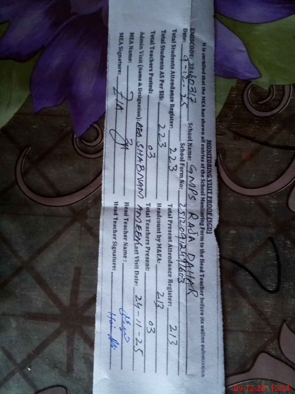 | Attendance Register | Head Teacher | MEA with School | Visit Proof |