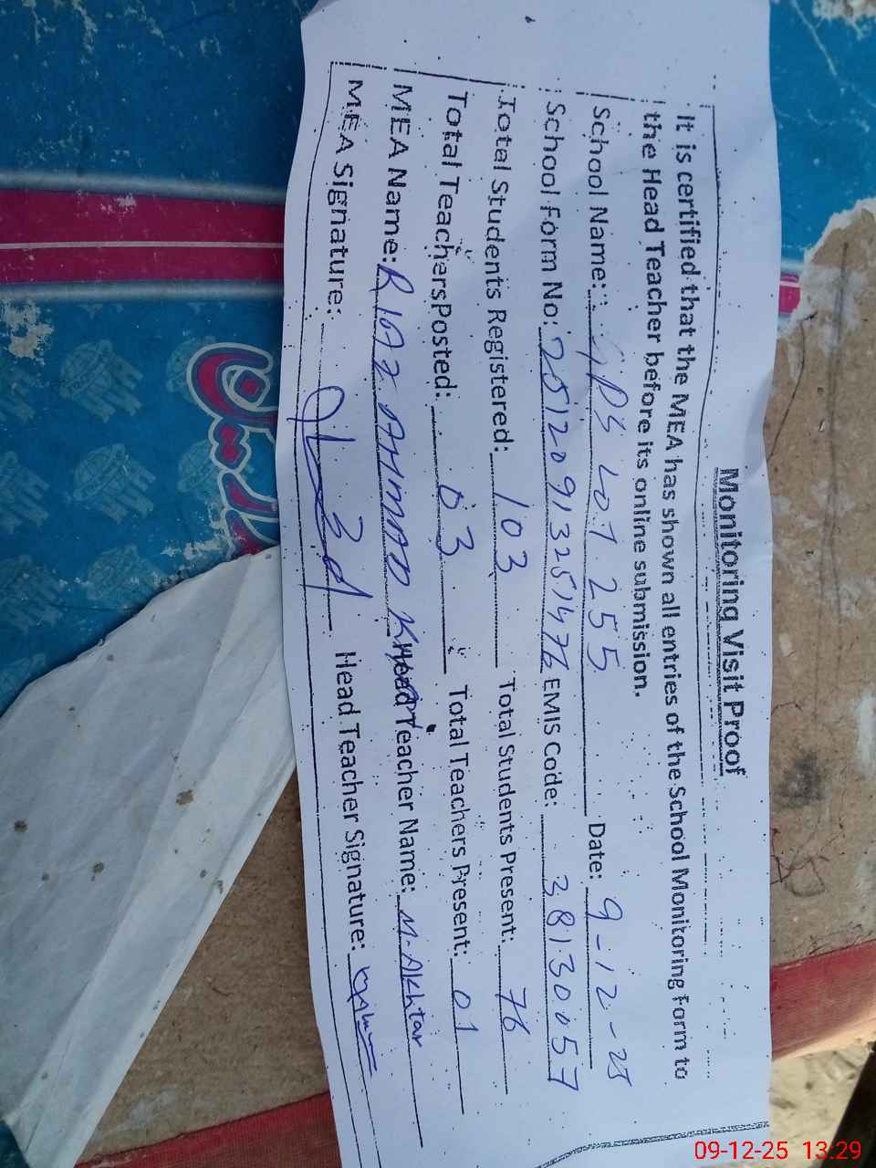 | Attendance Register | Head Teacher | MEA with School | Visit Proof |