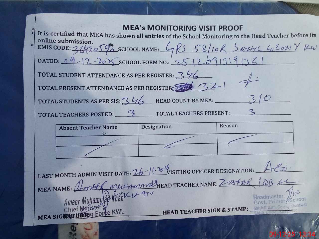 | Attendance Register | Head Teacher | MEA with School | Visit Proof |