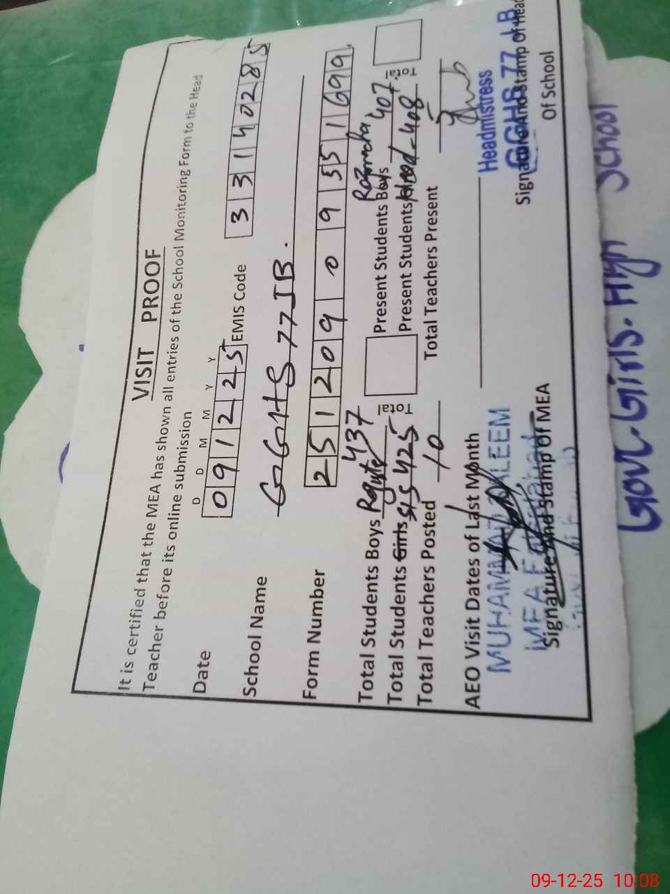 | Remarks (Use Separate Page if Required): Head teacher Hafiza Ambreen arrived school at 0922 loose electric boards in rooms FTF not a accurate | |||||