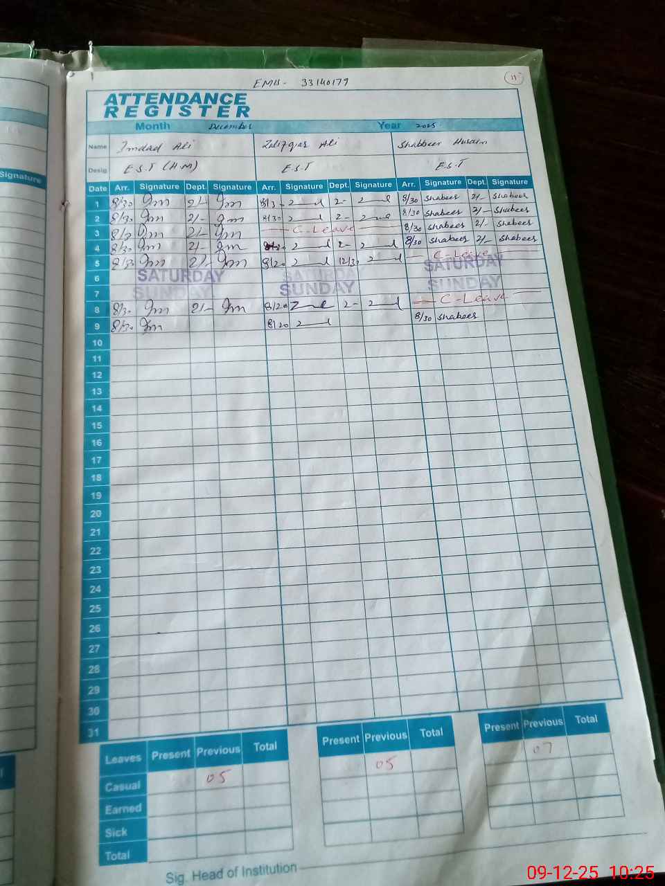 | CNIC | Full Name | Designation | R/C | Absence during last cal. month |