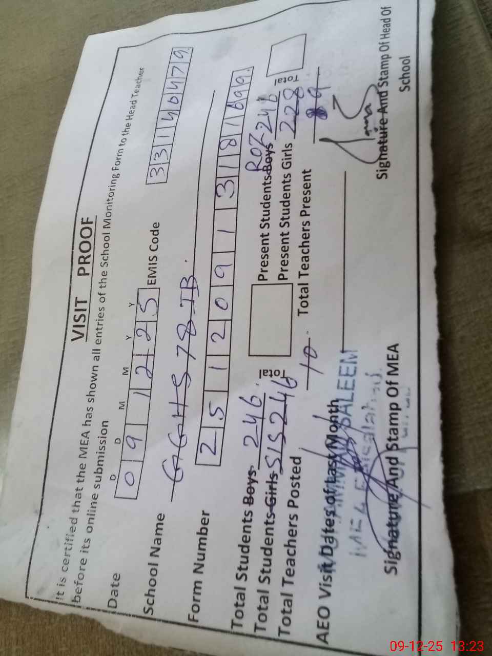| Attendance Register | Head Teacher | MEA with School | Visit Proof |