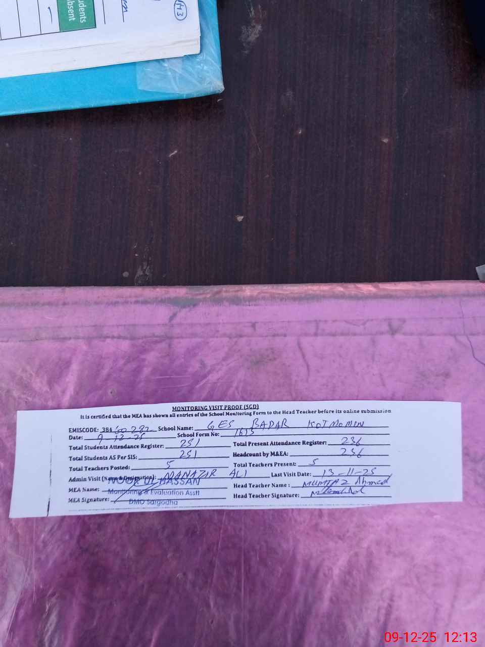 | Attendance Register | Head Teacher | MEA with School | Visit Proof |