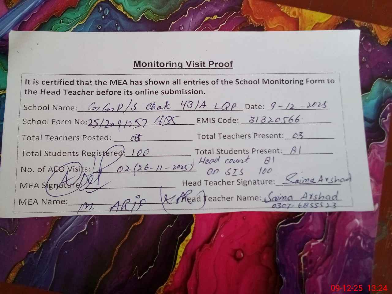| Attendance Register | Head Teacher | MEA with School | Visit Proof |