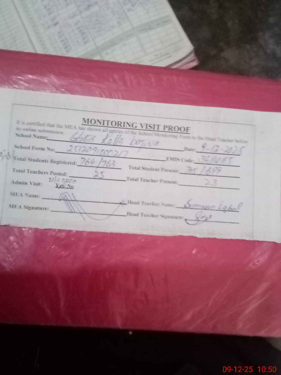 | Attendance Register | Head Teacher | MEA with School | Visit Proof |