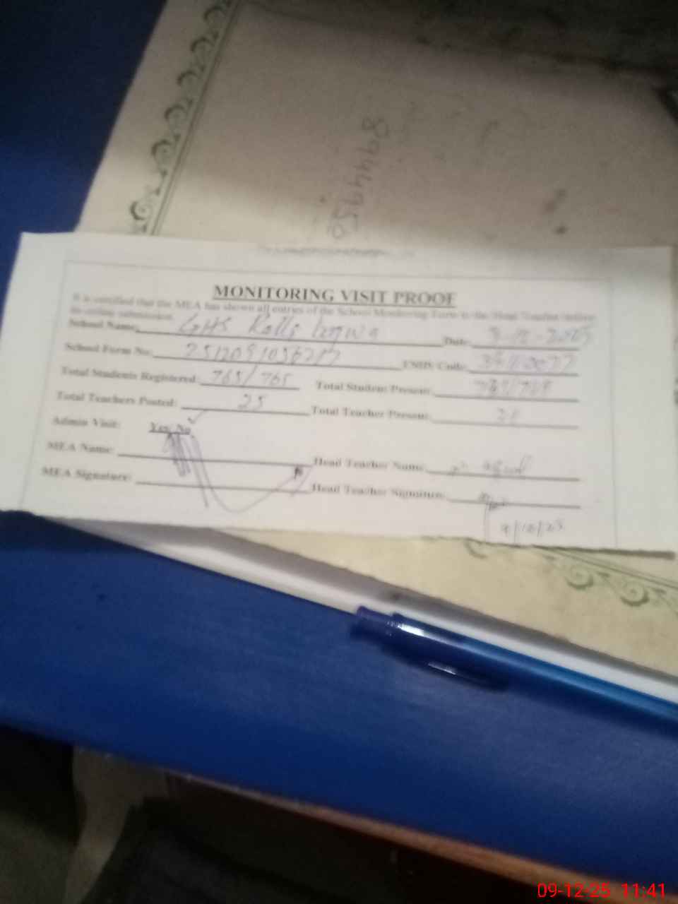 | Attendance Register | Head Teacher | MEA with School | Visit Proof |