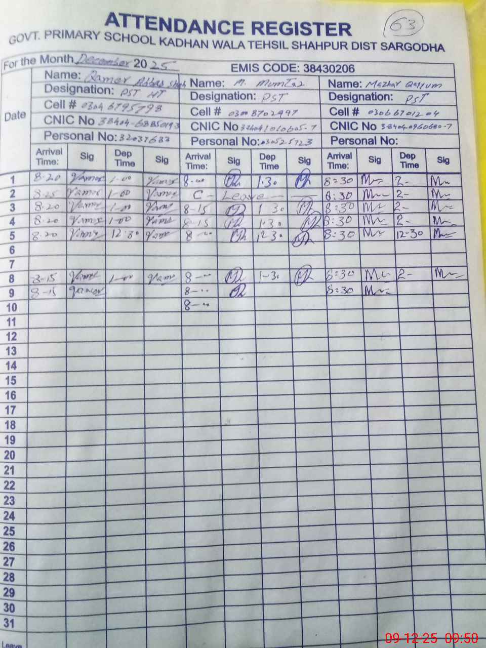 | Name: QA**** AB**** SH**** Designation: (School Headmaster's/Headmistress's) PST Phone/Cell Number: 03**** |