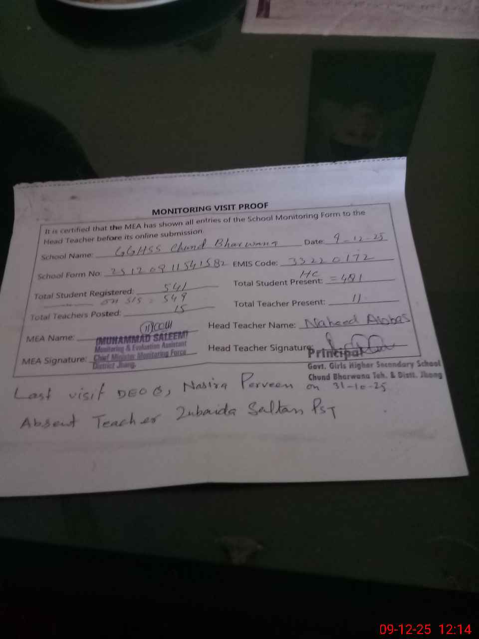 | Attendance Register | Head Teacher | MEA with School | Visit Proof |