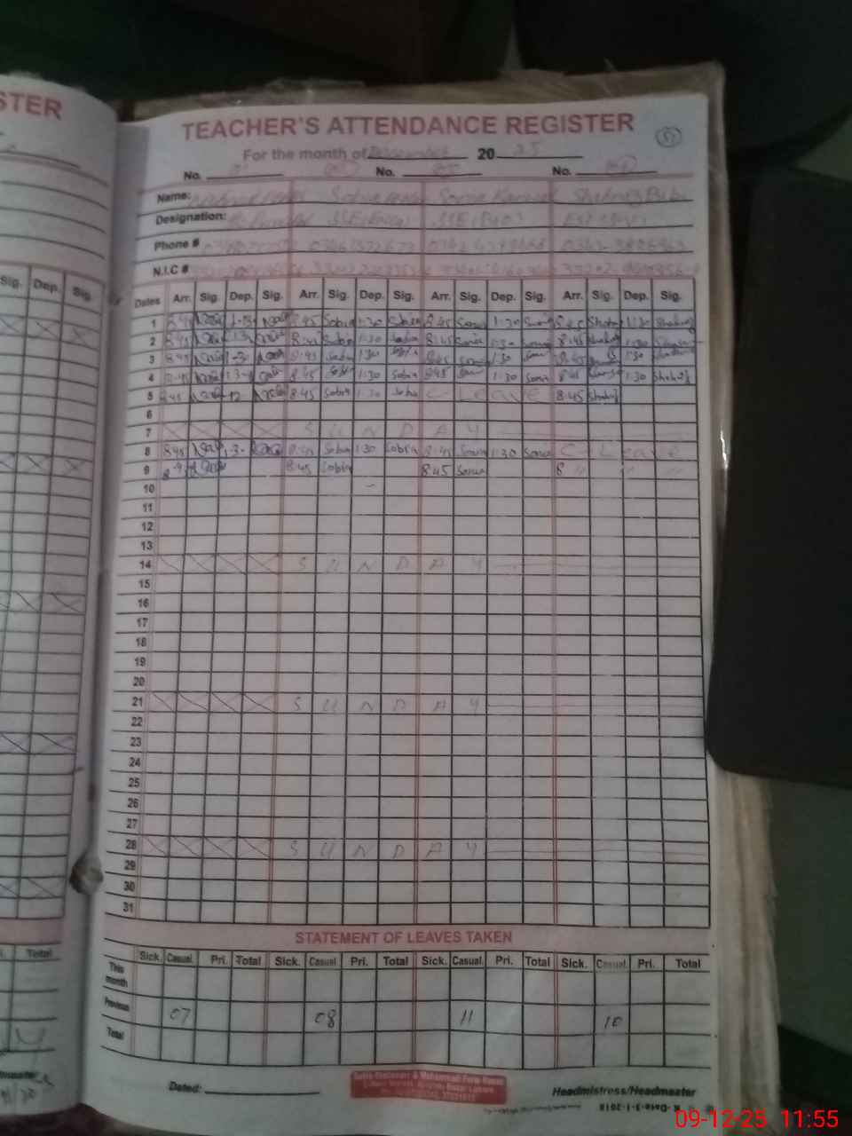 | CNIC | Full Name | Designation | R/C | Absence During Last Calender Month |
