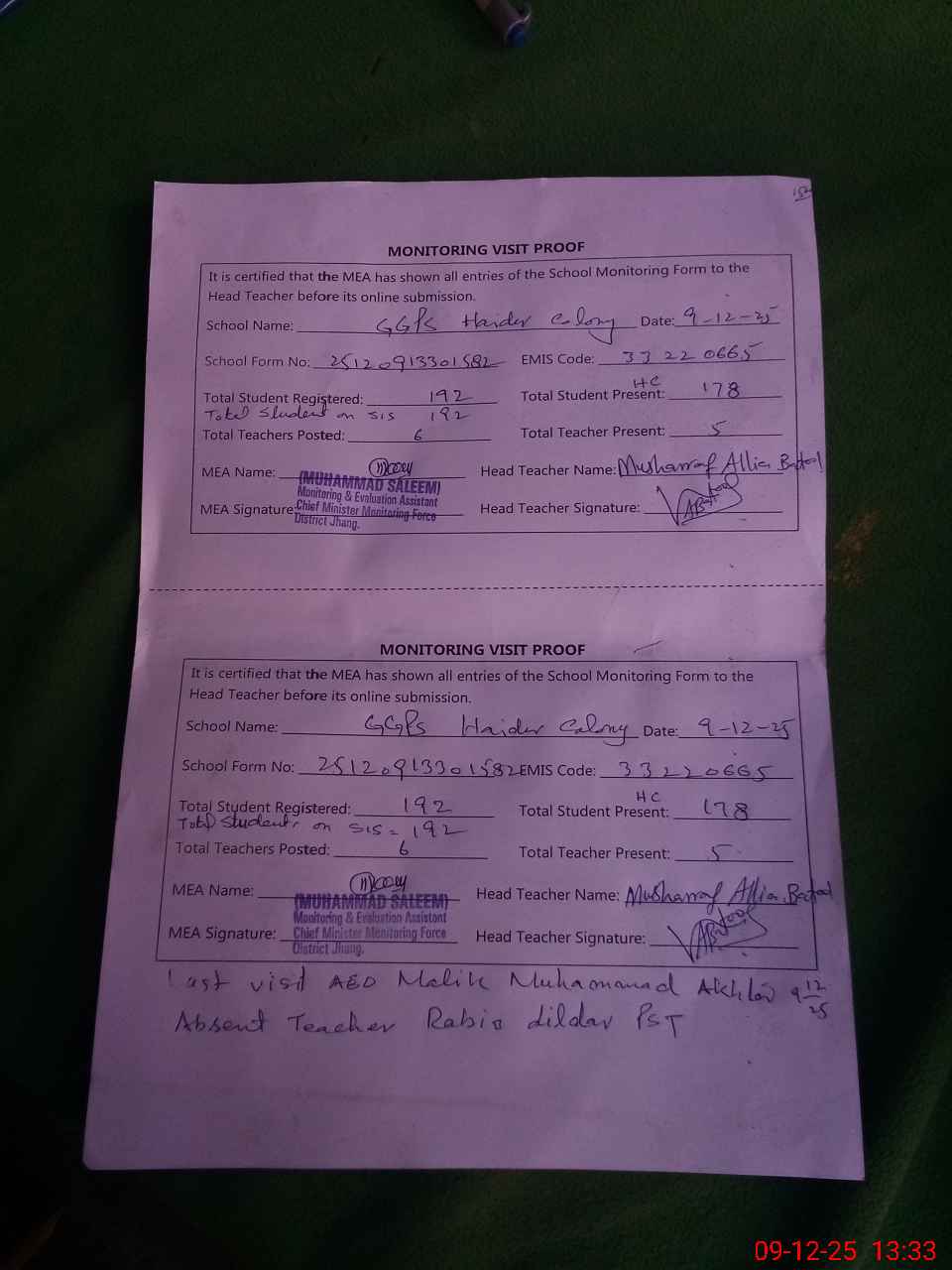 | Attendance Register | Head Teacher | MEA with School | Visit Proof |