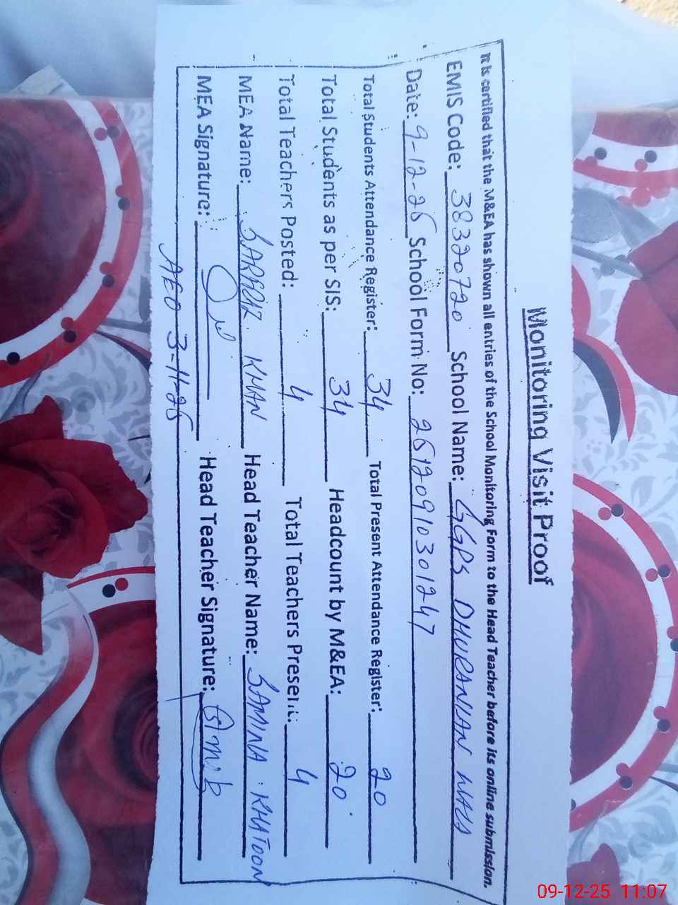 | Attendance Register | Head Teacher | MEA with School | Visit Proof |