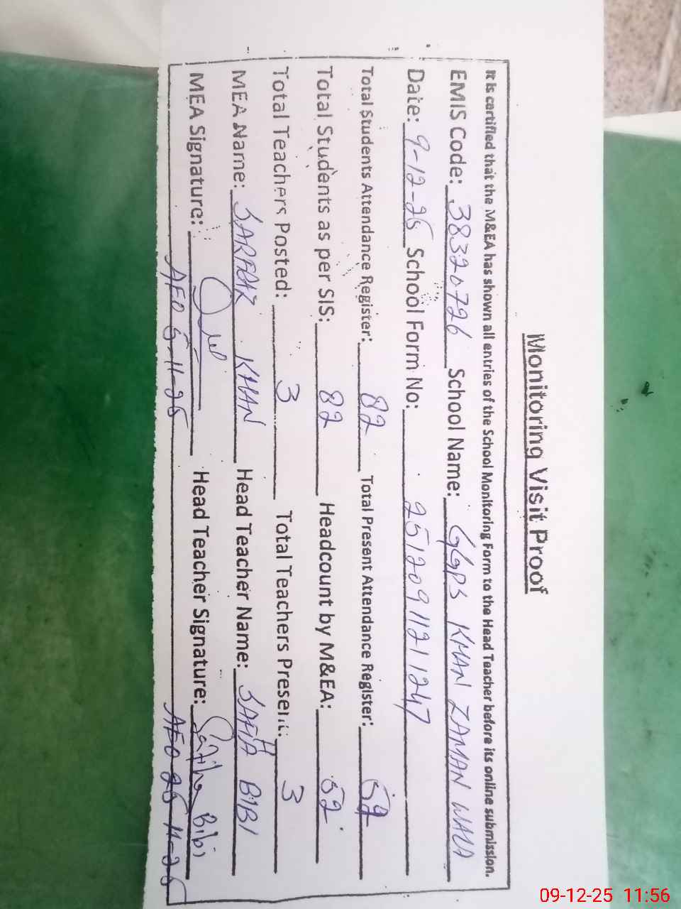 | Attendance Register | Head Teacher | MEA with School | Visit Proof |