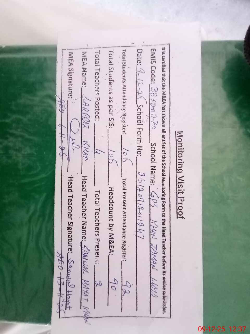 | Attendance Register | Head Teacher | MEA with School | Visit Proof |